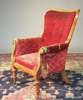 with upholstered back and seat flanked scroll arms with carved panels and cushion fringe on baluster turned front legs