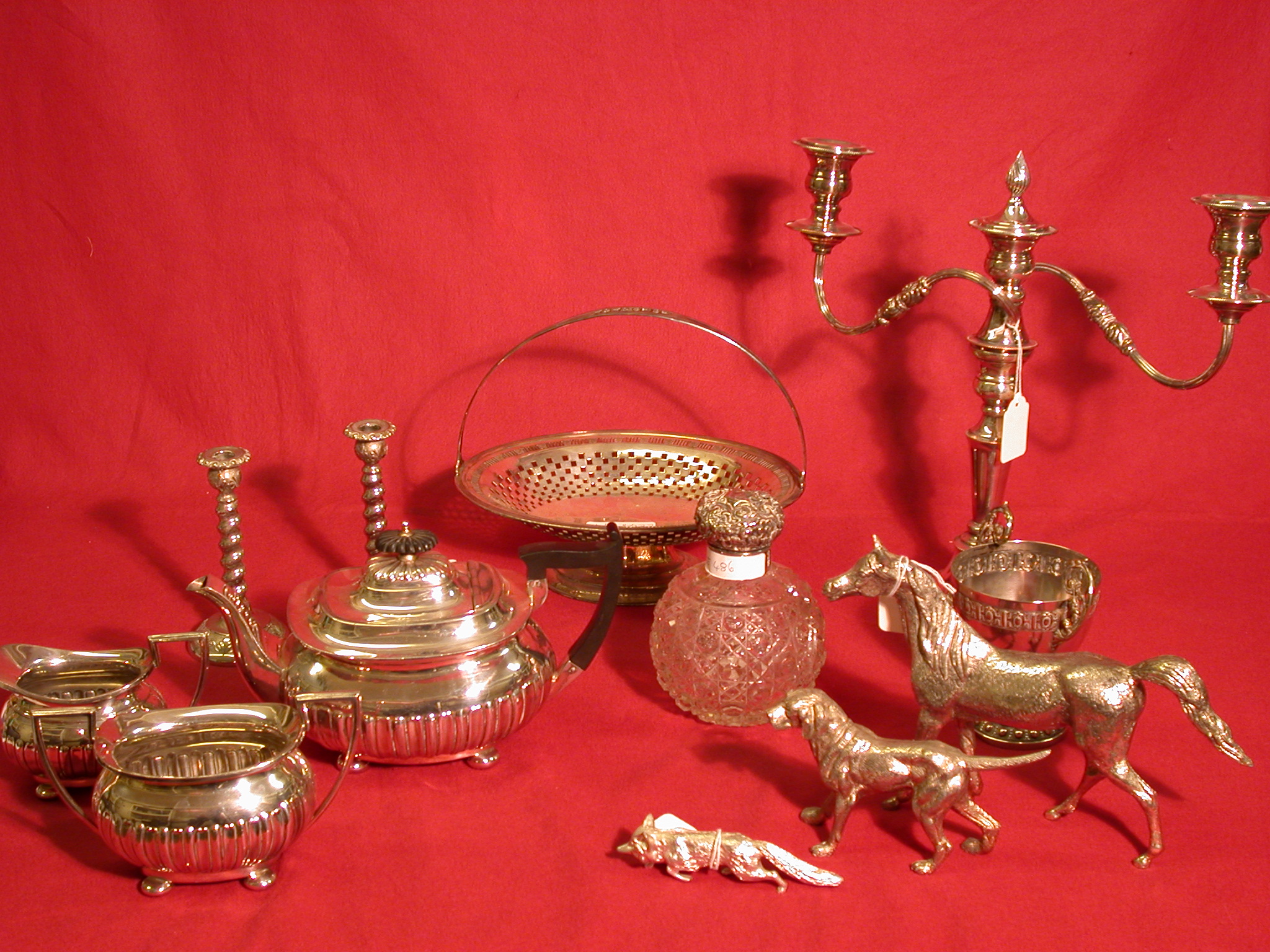 to include a pair of plate on copper two-branch candelabra, tea-service, condiment set , cake basket, cast metal horse, fox to hounds, silver condiments etc.