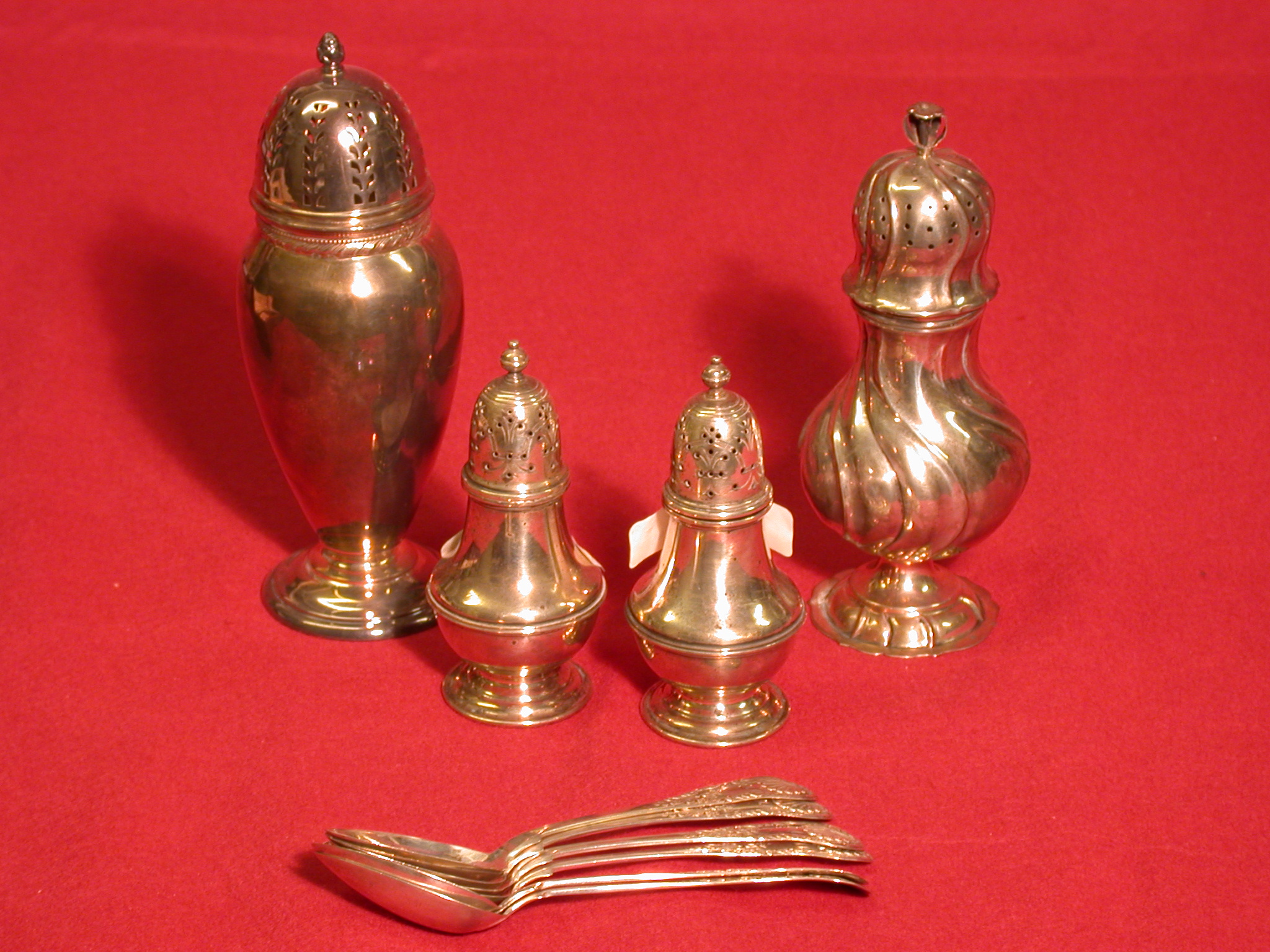 A group of 2 casters and 2 pepperettes, and a set of six George III Scottish silver small teaspoons