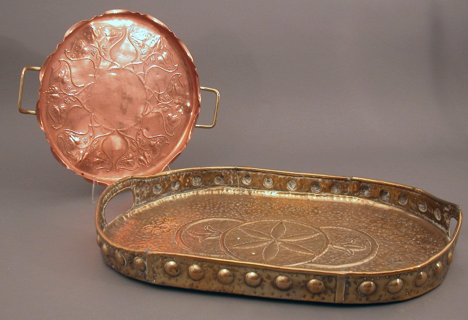 of rounded rectangular form, with flowerhead and leaf repousse decoration on a hammered ground, the galleried sides with faux rivet decoration and cut out handles, 52cm across, also a circular copper twin handled tray with embossed foliate motifs, 38cm diameter (2)