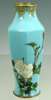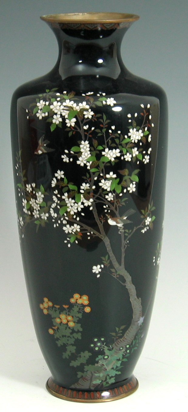 the flared neck with geometric pattern above dark blue ground, depicting a tree with white blossom and birds, above flared foot with geometric pattern, 38cm high; A small Japanese cloisonné hexagonal vase, Meiji period, he narrow neck with peacock feather decoration above a pale blue ground decorated with white peony and foliage, signed on the base, 16cm high (2)