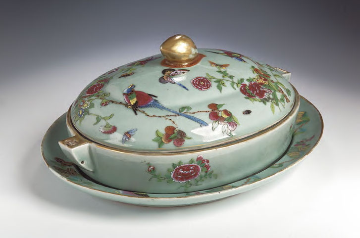 with celadon green ground, the cover with gilt cowrie shell finial, above painted exotic birds, butterflies and flowers, the body with gilt line to the rim, decorated with peonies, the oval stand decorated with birds, butterflies and flowers