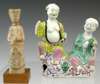depicting a fat bellied man wearing an open yellow robe seated next to a turquoise robed man, on unusual marbled naturalistic plinth, 21cm high; and a Chinese Tang Dynasty red clay model of an attendant (damaged) on fitted modern plinth, 16.5cm high (2)