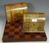 16cm high; another domed walnut tea caddy, 16cm high; and an inlaid chequer board with boxed draught set