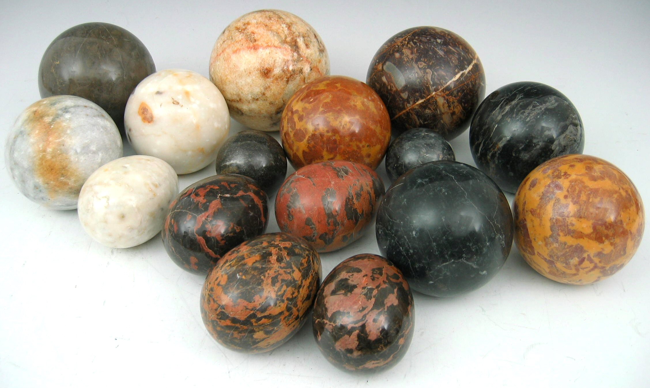comprising three large balls 12cm diameter, six medium sized balls with flattened bases 10cm diameter, two small balls 6cm diameter, and five eggs (16)