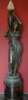 cast as a girl wearing classical attire, holding aloft an amphora fitted with frosted glass frame shade and raised on a fluted plinth, the circular oak base with leaf carved rim