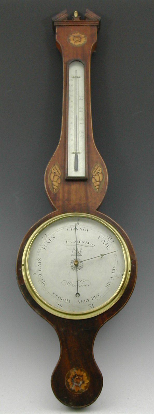 with thermometer and silvered pressure dial, within a shaped case inset with shell and rosette paterae and with boxwood and ebony stringing