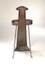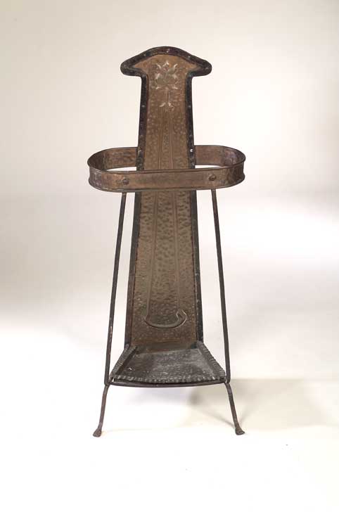 the back plate of tapering form, repoussé decorated with stylised plant form, and having beaten stick support with removable drip-tray below