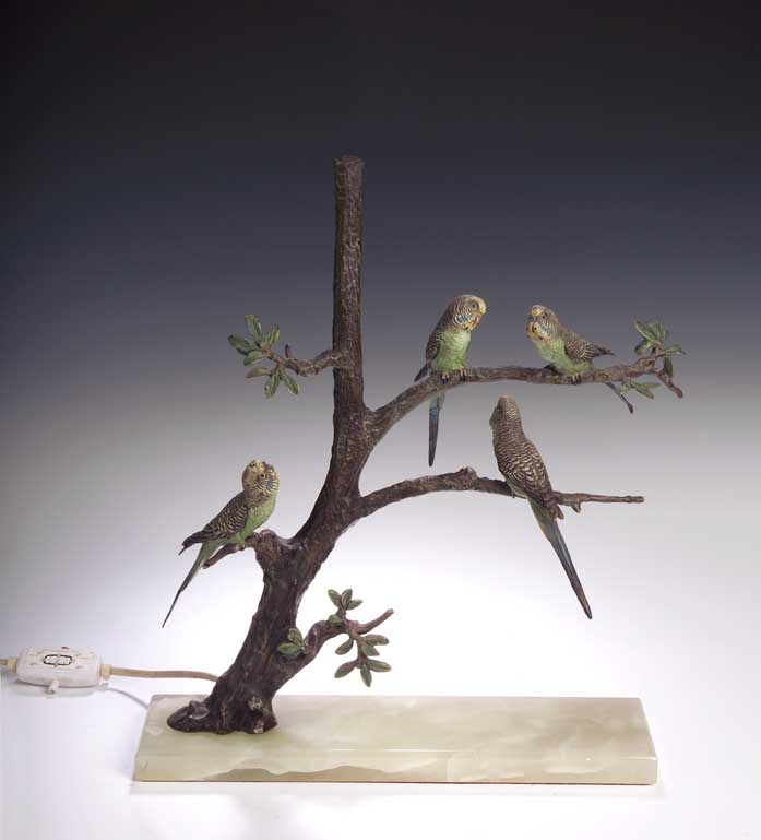 cast as four budgerigars perched on leafy branches, the whole raised on an onyx base