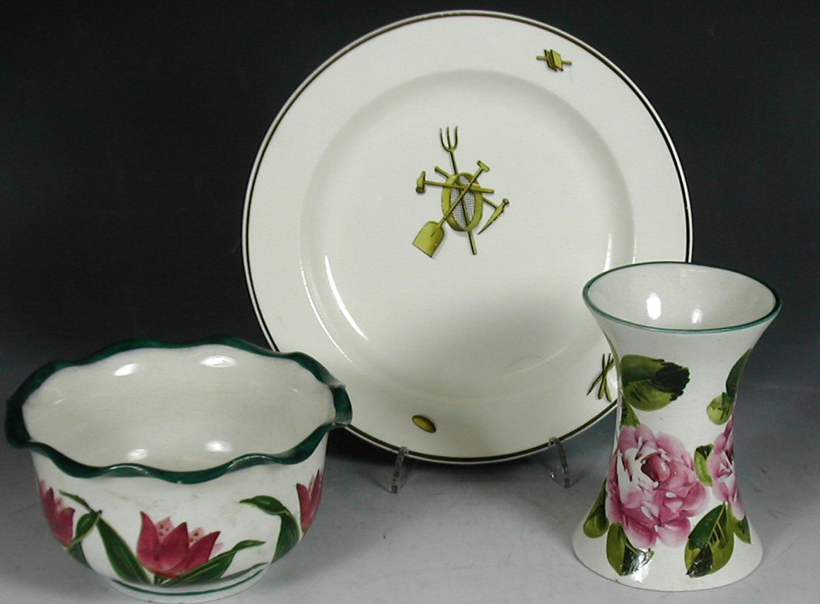 painted with roses, 12cm high; a Wemyss style bowl with scalloped rim and painted with tulips, 14cm wide; and seven Wedgwood plates, with printed decoration relating to gardening, etc. (9)