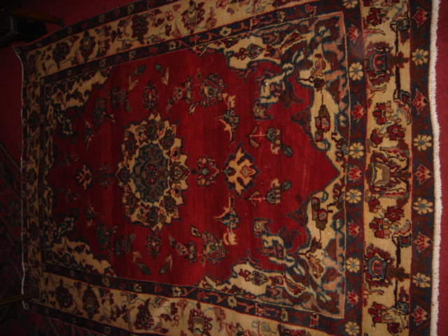 the red field with coloured cream medallion, similar spandrels, within cream palmette border between bands, 211 x 144cm; a Kirman rug, the rust red field with central cream medallion, 198 x 129cm; and a Serabend rug, the red field with allover boteh pattern, 211 x 130cm (3)