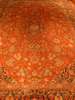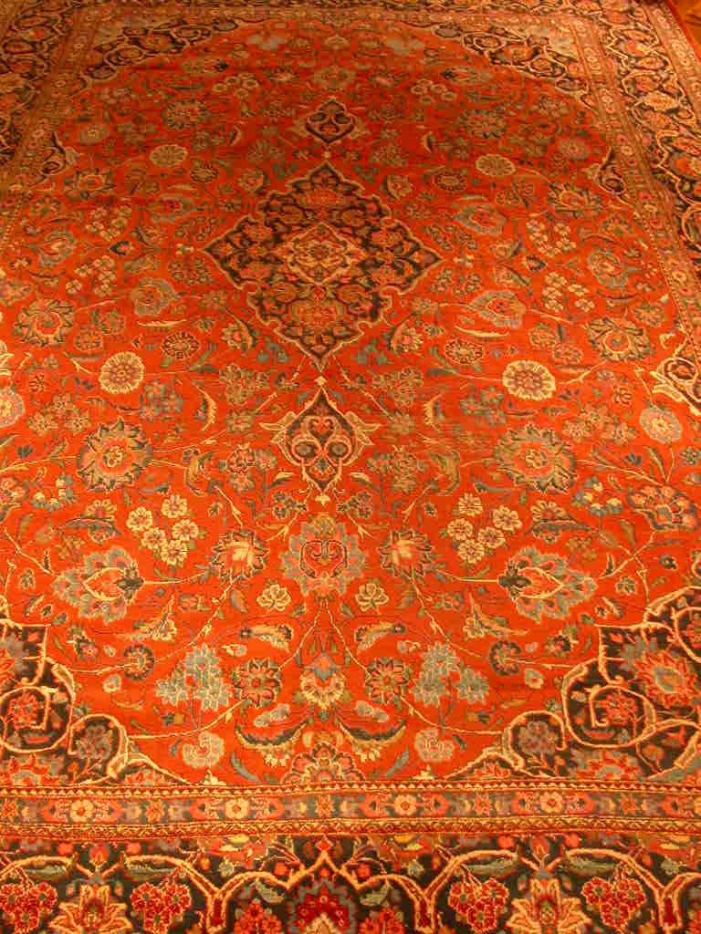 the red field with central indigo medallion suspending pendants, similar spandrels, within indigo palmette and floral vine border between bands