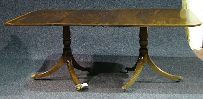 A mahogany satinwood inlaid twin pedestal dining table,