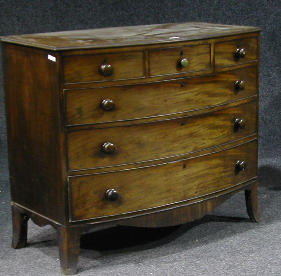 An early 19th century mahogany bow front chest of drawers,