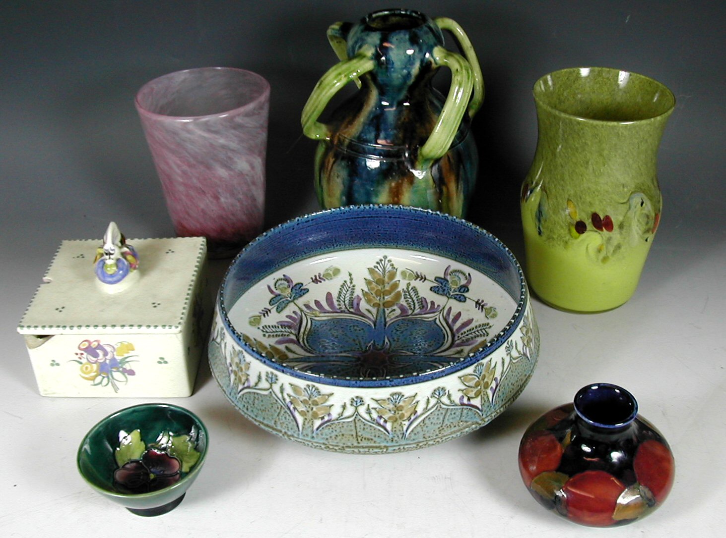 8.5cm high; a small Moorcroft bowl, decorated in the bowl with a pansy, 9cm wide; A yellow Strathearn vase, 19cm high; a pink Monart style vase, 15.5cm high; a Belgian four handled vase with mottled glaze, 23cm high; a Royal Copenhagen bowl with stylised flower decoration; and a Poole Pottery square honey dish and cover, the finial with a bee alighting on flowers (damaged), 12.5cm wide (7)