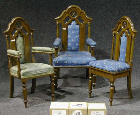 including one large and one normal armchair, each with moulded arched back enclosing padded panel, board, seat with squab (armchairs with stuffover seats), turned front legs (12)