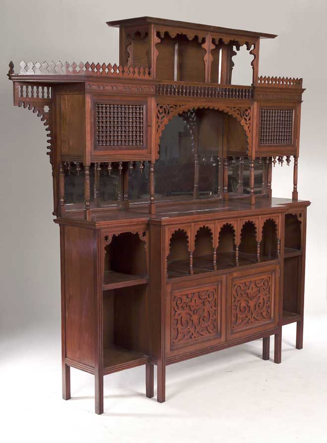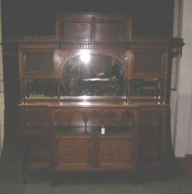 the three tier superstructure profusely decorated with Mushrabiyeh turnings, ogee arches and fretted supports, and with mirrored back, the base with breakfront top above arcaded open shelf and blind fretwork arabesque panelled doors below flanked by open shelves on moulded supports, bears paper label