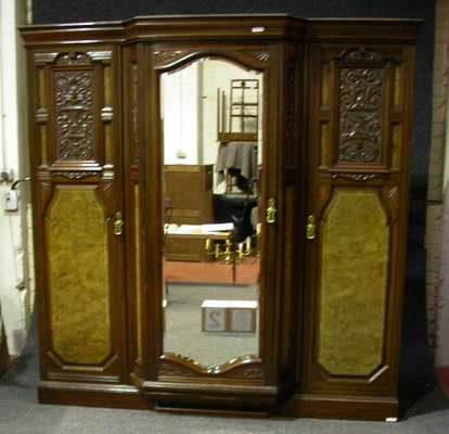 the moulded cornice above central mirrored door flanked by two carved and burr walnut panelled cupboard doors, on plinth base