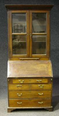 the moulded dentilled cornice above two glazed doors, enclosing shelves, above a slide, the lower section with fall flap, enclosing a fitted interior, over one long, two short and two long drawers, on bracket feet