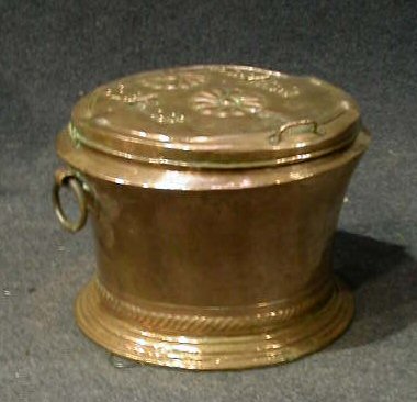 the hinged circular lid embossed with floral motifs and inscribed "Anno 1719", the tapering body with ring handles, on spreading base