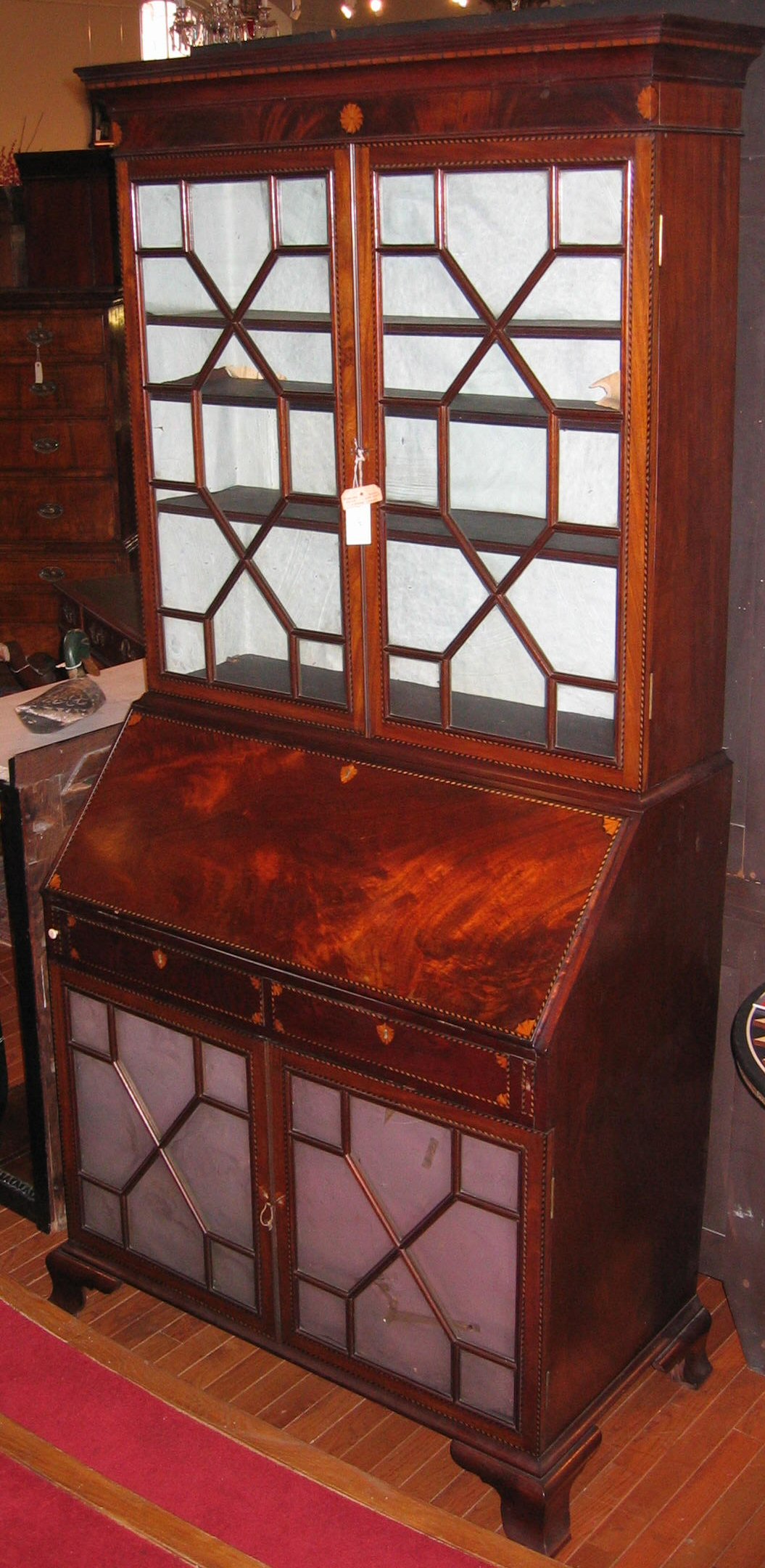 with chequer stringing, the projecting cornice above two astragal glazed doors with ebony and box inlay and fan patera, the sloping fall with similar inlay enclosing fitted interior above two drawers with two similar lower doors raised on ogee bracket feet