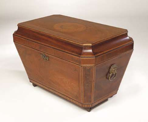 with boxwood and ebony stringing and banding, of sarcophagus form, the rectangular top centred by inlaid urn medallion with canted angles and concave frieze enclosing the tapering body with lion mask handles, and castors