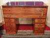 the rectangular top with moulded edge above false front secretaire drawer enclosing sliding writing tray and well, raised on pedestals with three graduated drawers, plinths and carrying handles to sides