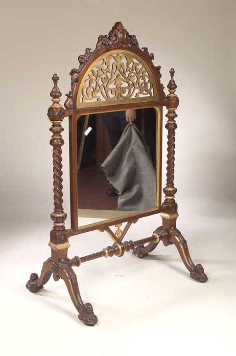 the rectangular mirror plate with arched frame with leaf carved sumount enclosing cartouche bearing initial D and pierced foliate panel, flanked by spirally turned uprights and stretcher, on carved cabriole legs with leaf carved toes and castors