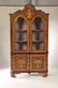 profusely decorated with floral marquetry and birds, the shaped arched cornice above a pair of arched glazed doors enclosing shaped shelves, the base with a pair of panelled doors and shaped bracket feet