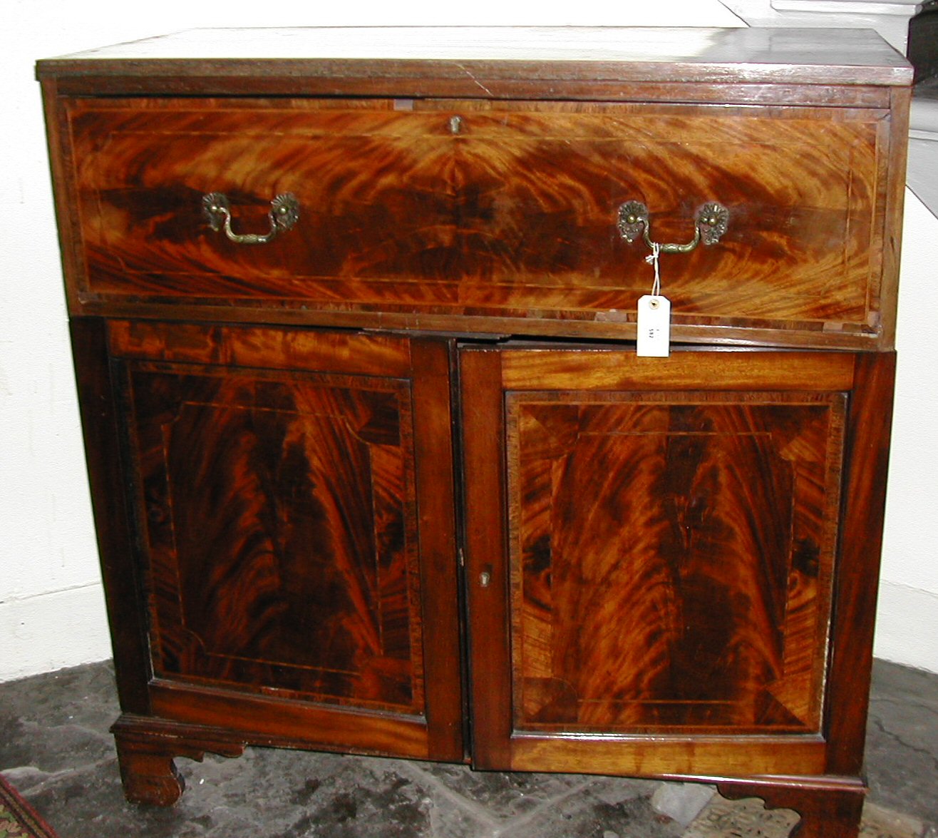 with boxwood stringing, the rectangular top above fall front secretaire drawer with fitted interior and pair of panelled crossbanded doors enclosing shelves, on shaped bracket feet
