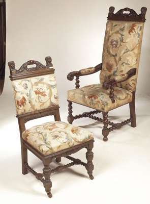 including two larger armchairs, each with arch acanthus carved top rail incorporating pierced handle with lion's mask terminals, above upholstered panel and stuffover seat, turned and blocked front legs and H-stretcher, flamework upholstery. (5)