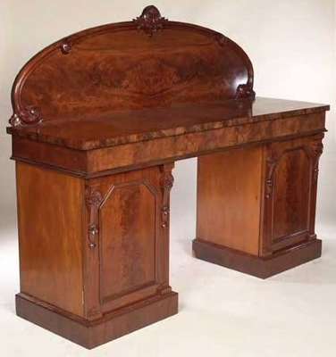 the arched flame veneered ledge back with cresting above rectangular top and frieze drawers, a pair of pedestals with panel doors and plinths