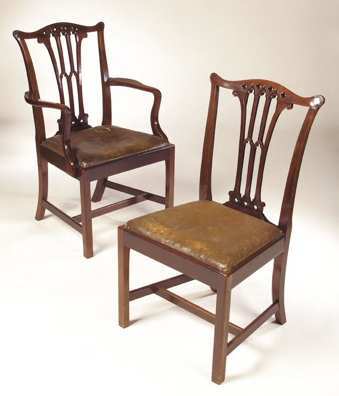 including two carvers, each with quatrefoil pierced top rail and Gothic arched pierced splat, drop-in seat, on square section chamfered legs joined by H stretcher