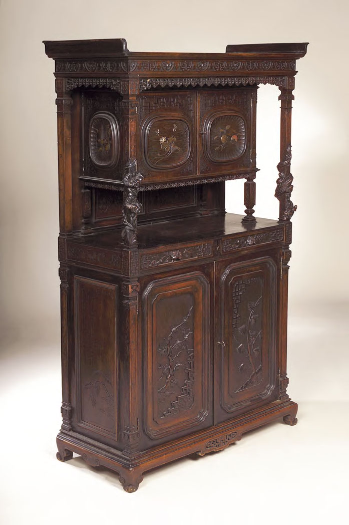 with blind and pierced fretwork decoration, decorative panels with applied metal and ivory details, the cornice above inset cupboard with square supports carved with dragon and flowers, above pair of drawers and cupboard doors, plinth with scroll feet, stamped V OPAVA