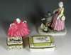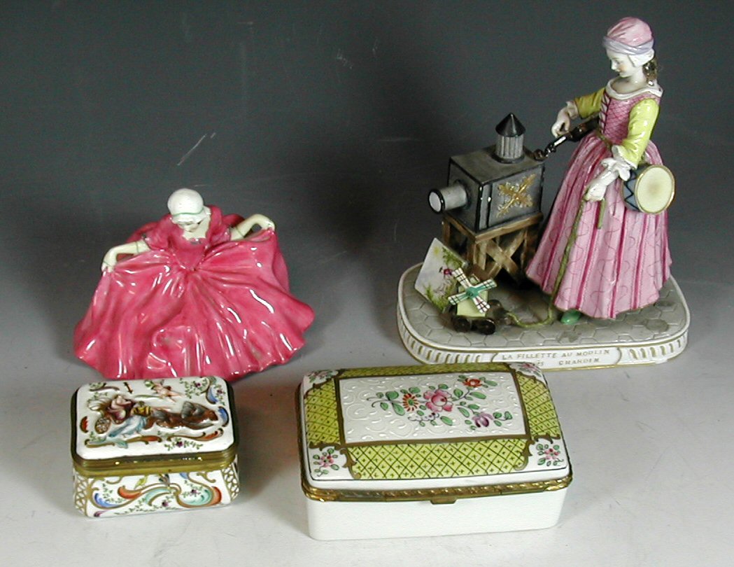 of a woman holding a violin and a drum standing next to a magic lantern "La Fillette au Moulin, d'apres Chardin"; a Royal Doulton figurine "Polly Peachum"; and two ceramic trinket boxes (4)