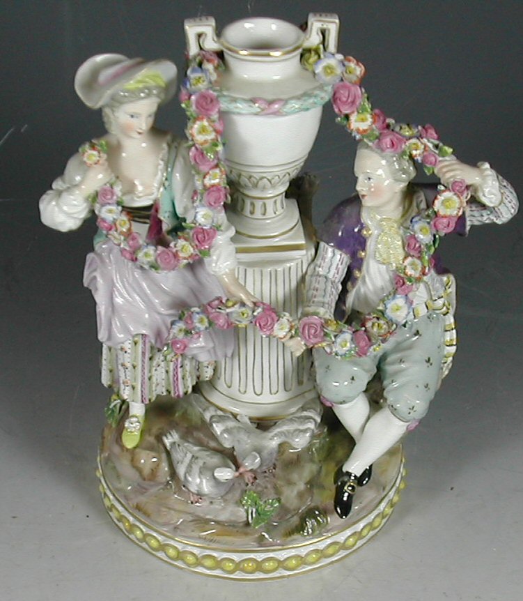 depicting a man and a woman either side of an urn on a plinth, with a child seated behind, with a pair of turtle doves, holding swags of flowers, on a circular plinth
