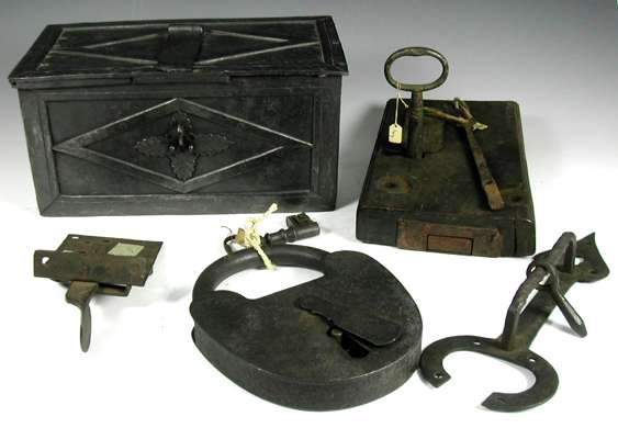 decorated with lozenges on each face [missing handles and broken padlock clasp] no key, an 18th century Scottish iron (door rasp) tirling pin, a large iron padlock and key, a wooden rim lock and key iron lock (4)