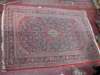 the indigo field with central red and ivory lozenge medallion suspending pendants, similar spandrels, within indigo palmette and scrolling vine border between light blue and ivory bands
