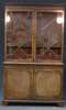 with blind fretwork beneath cornice, two astragal glazed doors, opening to reveal a series of shelves, over base with hinged doors on bracket feet