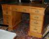 the rectangular top with inset scriver, above three opposing two drawers on twin pedestals with opposing drawers and cupboards to plinth bases,