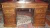 with moulded leather inset pedestal top, three short drawers over three graduated to each pedestal and plinth base