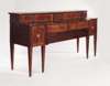 with boxwood stringing, the stage back with two sliding doors enclosing infastructure, the semi bowed breakfront top above three frieze drawers with deep drawer below flanking two deep drawers and raised on square tapering legs