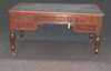 the rectangular moulded top with inset leatherette scriver, over on long drawer flanked by two short drawers, on baluster legs to brass caps and castors,