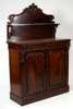 the arched backboard with scroll carved cresting and fitted with a shelf, the wavy moulded rectangular top above two similarly moulded frieze drawers and two panelled cupboard doors, on plinth base
