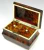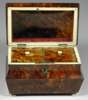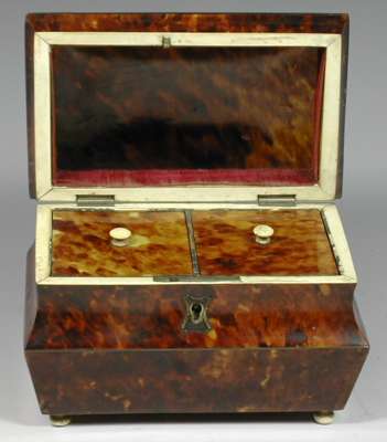 the domed hinged lid opening to reveal an interior fitted with two lidded compartments for tea, the convex tapering sides raised on turned ivory feet