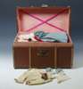 including two wicker hats, each with ribbon trim; a cream wool double breasted coat and various whitework gowns and bonnets; and a Oriental style bisque doll's house doll, 7cm high, contained within a wood and brass bound leatherette travelling trunk, 38cm wide (qty)