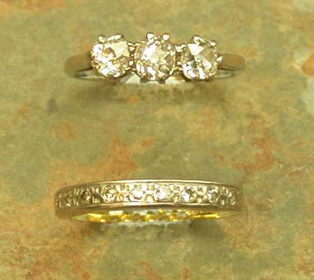 claw set with three old mine cut diamonds; together with a single cut diamond set half-eternity ring (2)