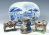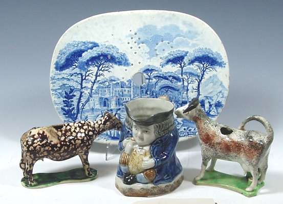 painted in colours, 16cm wide; another Staffordshire pottery cow creamer; an early 19th century blue and white printed pottery meat drainer, 32cm wide; and glazed pottery toby jug (4)