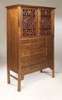 the projecting moulded cornice above two sliding fretwork doors, carved with roundels of flowering chrysanthemum, above an arrangement of four banks of six small drawers, raised on square legs