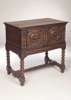 the rectangular top above two cupboard doors with octagonal moulded panels, divided and flanked by pairs of turned demi columns, the stand with ball turned and block legs, joined by similar stretchers